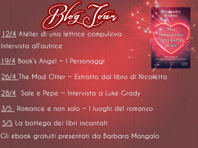- Venerdì 5 Maggio: nel sito La bottega dei libri incantati avverrà una tappa curiosa, nella quale Barbara Mangalo (se non sapete chi è vi suggerisco di trovare informazioni o leggendo il romanzo o leggendo le recensioni online) vi presenterà, in un articolo, alcune delle opere gratuite di Alessandra.