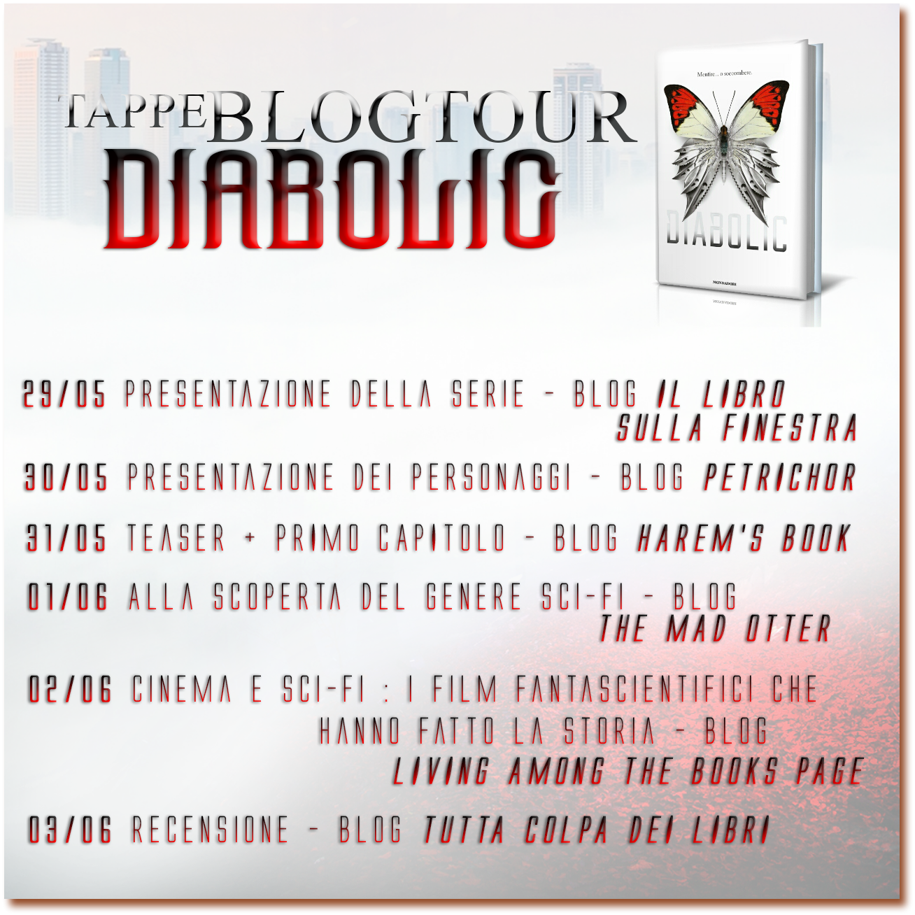 Meglio che mi fermi qui, altrimenti vado avanti per ore. Non perdetevi le altre tappe del Blog Tour e soprattutto recuperate “Diabolic” di Kincaid, disponibile dal 30 Maggio.